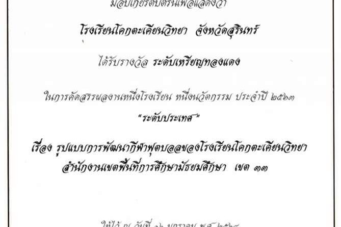ผลงานโรงเรียนไม่มีหมวดหมู่ 10 เมษายน 2024 admin โรงเรียนโคกตะเคียนวิทยา ได้รับรางวัลเหรียญทองแดง ระดับประเทศ การประกวดนวัตกรรม “หนึ่งโรงเรียนหนึ่งนวัตกรรม” ประจำปี 2563 รางวัลระดับเหรียญทองแดง การคัดสรรผลงาน”ผลงานหนึ่งโรงเรียนหนึ่งนวัตกรรม ” (One School One Innovation : OSOI) ประจำปี 2563 ระดับประเทศ จากคุรุสภา Read More