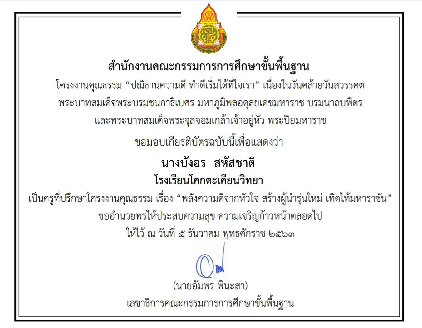 ได้รับเกียรติบัตรโครงงานคุณธรรม “ปณิธานความดี ทำความดีเริ่มได้ ที่ใจเรา” เพื่อถวายเป็นพระราชกุศลเนื่องในวันคล้ายวันสวรรคตพระบาทสมเด็จพระบรมชนกาธิเบศร มหาภูมิพลอดุลยเดชมหาราช บรมนาถบพิตร และพระบาทสมเด็จพระจุลจอมเกล้าเจ้าอยู่หัว” จากสำนักงานคณะกรรมการการศึกษาขั้นพื้นฐาน