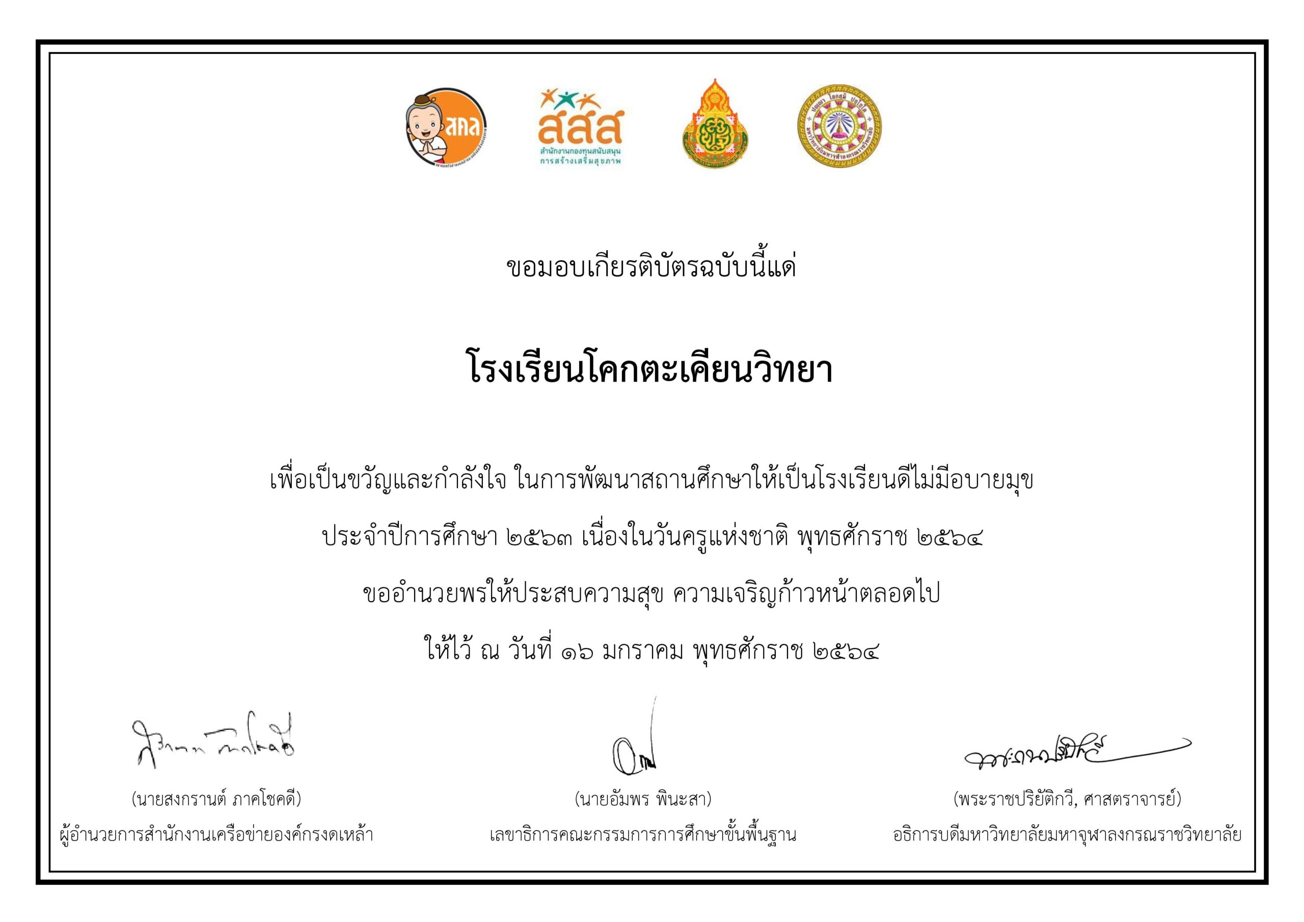 ผลงานโรงเรียน โรงเรียนโคกตะเคียนวิทยา ได้รับเกียรติบัตรโรงเรียนดีไม่มีอบายมุข ปีการศึกษา 2563 (ปีที่5) จากสำนักงานคณะกรรมการการศึกษาขั้นพื้นฐาน 3 พฤษภาคม 2024 admin