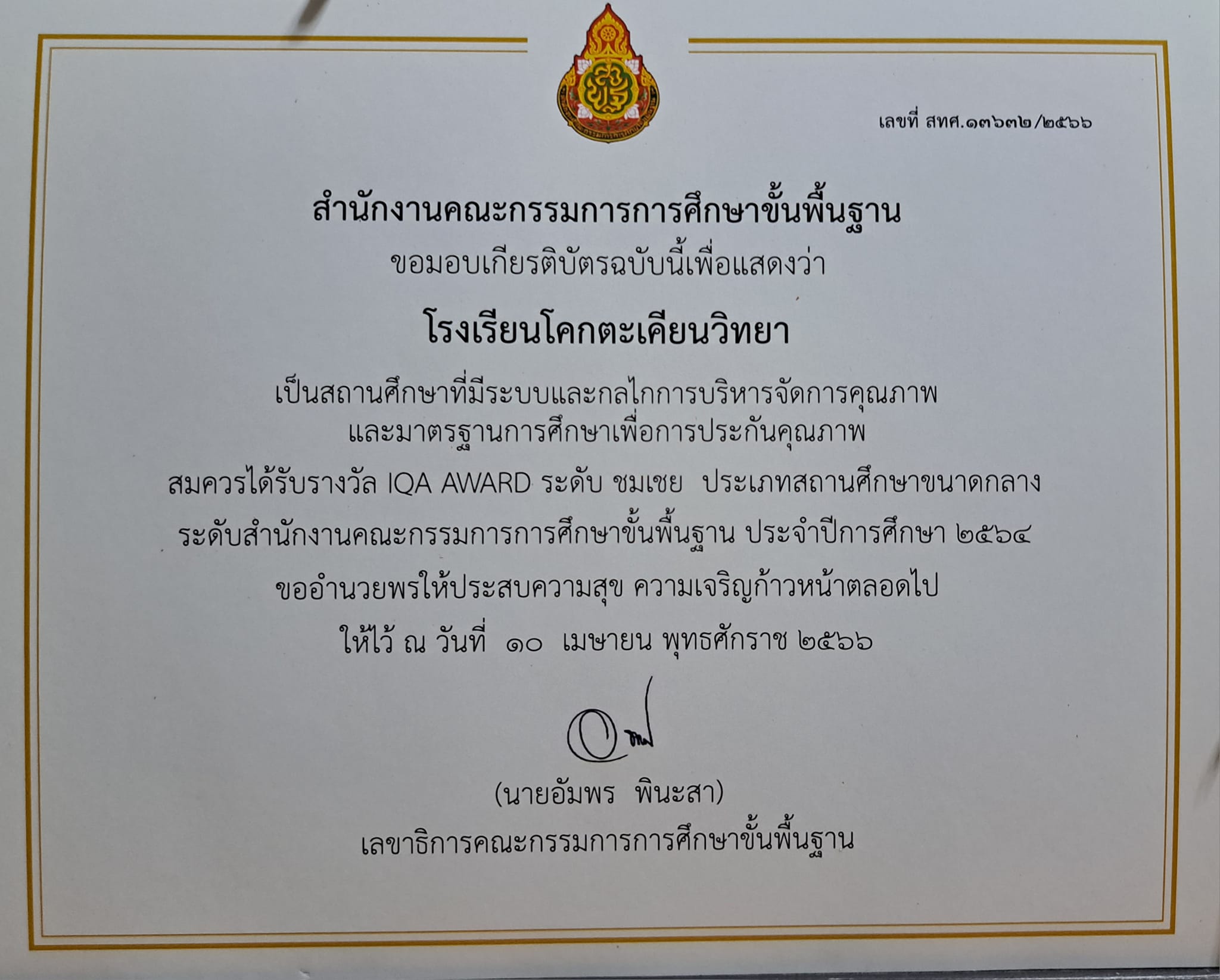 ผลงานโรงเรียน โรงเรียนโคกตะเคียนวิทยา ได้รับรางวัล IQA AWARD ระดับชมเชย ประเภทสถานศึกษาขนาดกลาง ระดับสำนักงานคณะกรรมการการศึกษาขั้นพื้นฐาน ประจำปีการศึกษา 2564 จากสำนักงานคณะกรรมการการศึกษาขั้นพื้นฐาน 3 พฤษภาคม 2024 admin
