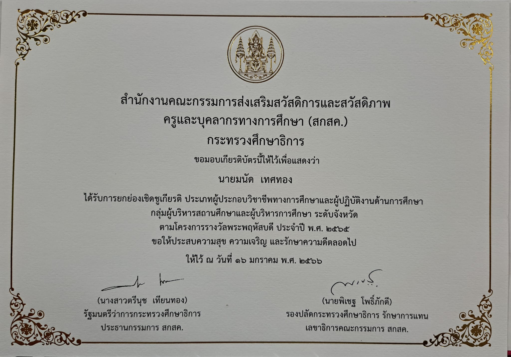 ผลงานโรงเรียน นายมนัด เทศทอง ได้รับเกียรติบัตรยกย่องเชิดชูเกียรติ ประเภทผู้ประกอบวิชาชีพทางการศึกษาและผู้ปฏิบัติงานด้านการศึกษา กลุ่มผู้บริหารสถานศึกษาและผู้บริหารการศึกษา ระดับจังหวัดตามโครงการรางวัลพระพฤหัสบดี ประจำปี พ.ศ. 2565 จาก สกสค. 3 พฤษภาคม 2024 admin